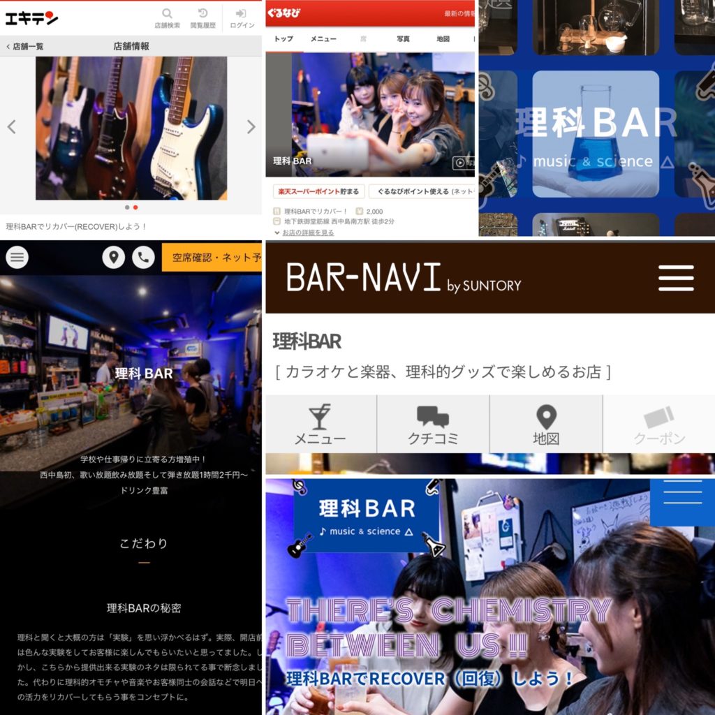 以上6つです。あと派生的にはぐるなびでの英語のページ、仕掛かり中のトリップアドバイザーのページも存在します。更新の頻度や方法がそれぞれ違ってたり…。未だに昔の姿になってるものもあります。また、その時の売り文句などにも違いがあり、比較してもらうと結構笑えたり…。理科BARの歴史がそこにあります。
