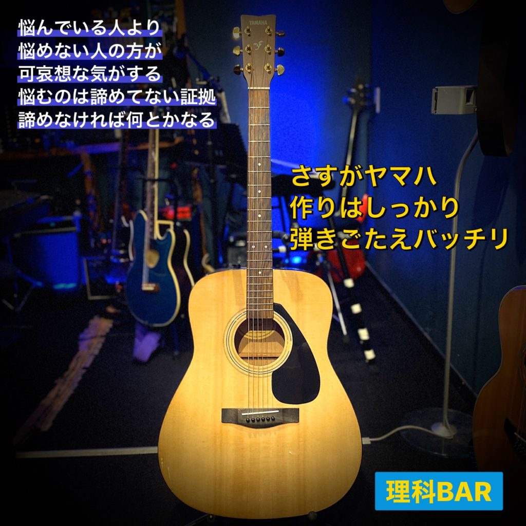仲間達と楽しむ事が出来るギターがフォークギター。「仲間ギター」だと語呂が良くないようですが…。このヤマハのギターはもともとはボディを叩くスラム奏法をする為に買った、かなりの廉価版なのです。でも普通にイイ音が鳴ってくれますし、弦を張りっぱなしなのにピッチも狂わないという優れもの。さすがヤマハ品質だといつも感心しているのです。値段も鳴りも民衆の事をよく考えて作られてます。仲間を作ってさらに親交を深めるにもうってつけのギターではないでしょうか。