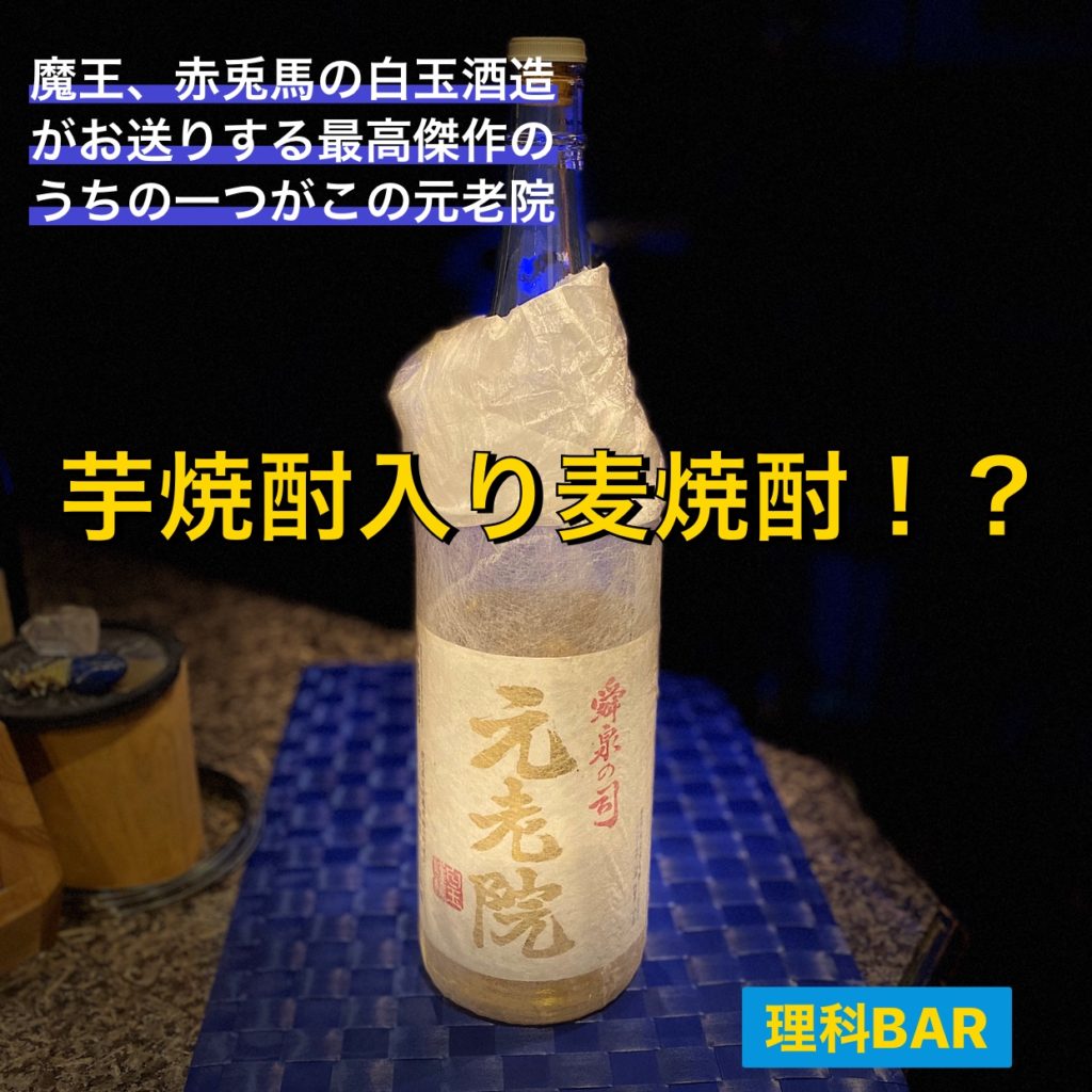 琥珀色の熟成麦焼酎です。でもただの麦焼酎ではなく、芋焼酎入りの麦焼酎なのです。麦焼酎の香ばしさは当然、熟成されているので味はまろやか。で、味はというと今度は芋焼酎のしっかりとした甘味の感じられるものに。という麦焼酎と芋焼酎のいいとこ取りの焼酎がこの元老院なのです。なんでそんなに完成されてるのかなと思って蔵元を見たら実はあの白玉酒造。焼酎の3Mの一角である魔王を作っているところです。さらには赤兎馬も作っているのです。改めてネットで調べてみたら「魔王にも引けを取らない銘酒」との事。なんと理科BARではこの焼酎でさえ飲み放題メニューのうちのひとつ。うん、通うしかないですね。