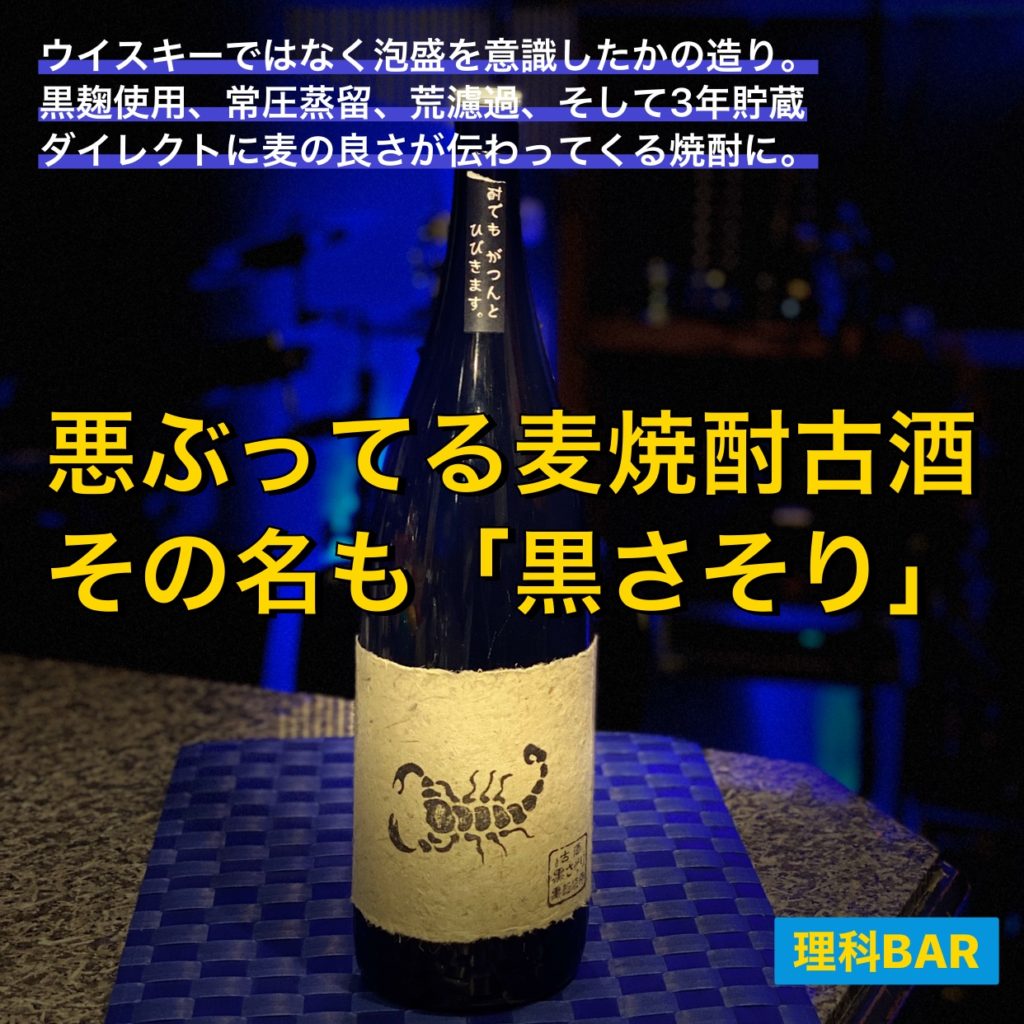 でもこの黒さそりはそう言ったスッキリ派ではなく、あえて泥臭い方法で作られてます。それがこの焼酎の個性で現れています。麹は泡盛や芋焼酎でもよく使われている黒麹を使いました。そしてあえて雑味が出るように常圧蒸留にしました。それだけでは尖った味になると思われるので泡盛の古酒がごとく3年貯蔵をしました。人の行く裏に道あり花の山を地で行った焼酎です。普通じゃ飽き足りない人、常識という言葉が大嫌いな人、好奇心の旺盛な人などは是非他の麦焼酎と飲み比べてみたら楽しいと思います。