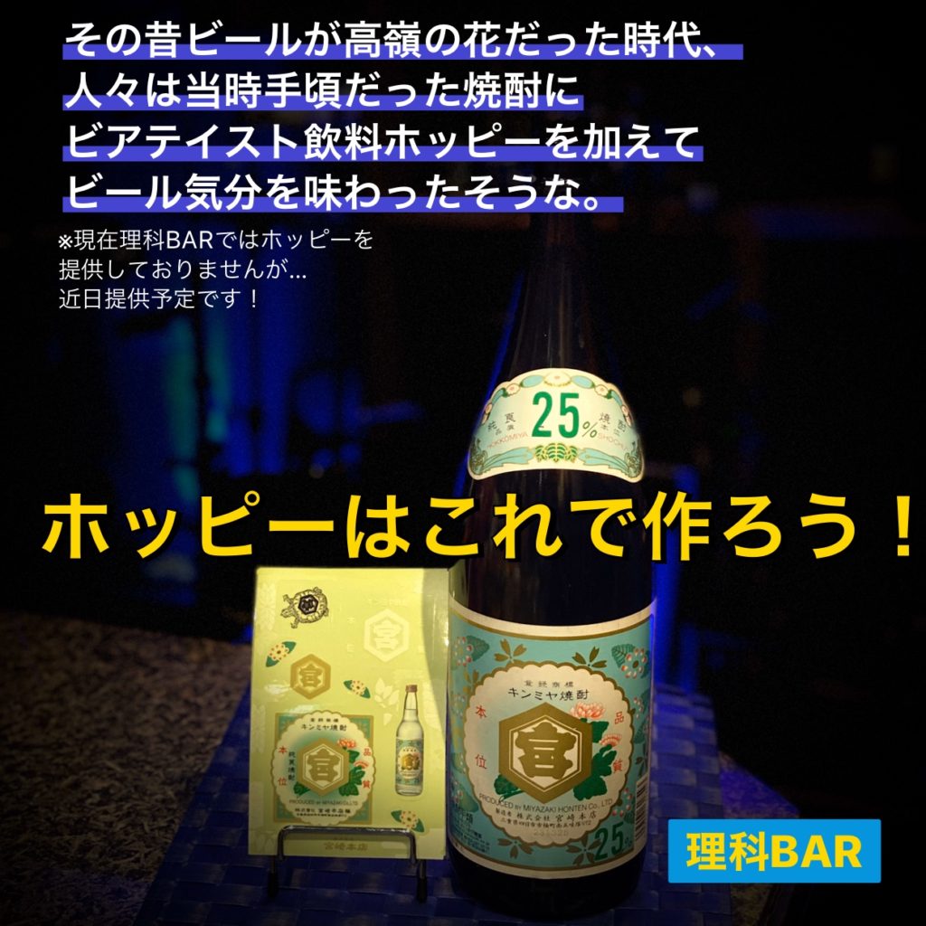 ホッピーはビアテイスト飲料と甲類焼酎のミックスドリンクです。お店ではそれぞれソトとナカと呼ばれて別々に注文出来ます。理想的な配合比率は焼酎1に対してホッピー5だそうです。これでアルコール度数は4%ほどでビールと同じくらいになるようです。低カロリーでプリン体ゼロと若干健康志向だと言われてます。ホッピーと相性のいい焼酎がこの金宮焼酎です。ホッピーの普及期にペアで販売されていたらしく、ホッピーには欠かせない焼酎の位置づけになってます。ビール気分の焼酎ですが、酔いはこちらの方が早そうです。