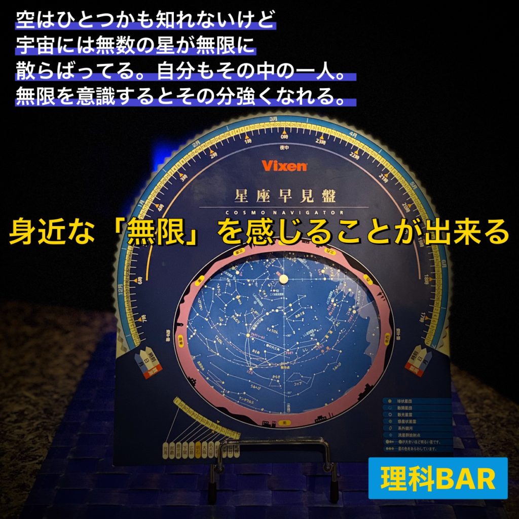 寒いと空気が澄んで星が見えやすくなりますよね。寒いのはストレスですけど澄んだ空気のちょっと張り詰めた雰囲気の夜空を見上げるのは何だか気持ちいいです。理科BARでは色々な刊行物をメニュー表と一緒に置いてたりしますが、案外この星座早見版は手に取る方が多いのです。小学校とかで使って懐かしい、という方がほとんどみたいです。