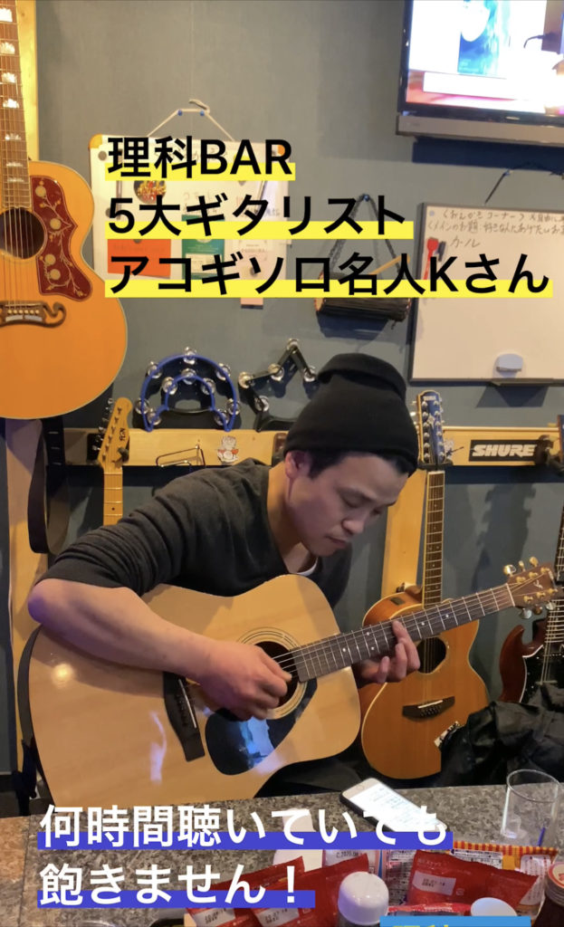 これだけギターがあればギタリストが集まるのは必然なのかもしれません。単純にお上手である事だけでなく、ギターを聴いている人にもその世界観が伝わる人を理科BAR5大ギタリストとして称させてもらつてます。今回はそのうちの1人kさん。アコギソロ名人。たぶんかなり弾き込んでいる人です。練習量は半端ないと推測されます。そのまま路上でもひとが集まるギターを弾きます。素晴らしい!