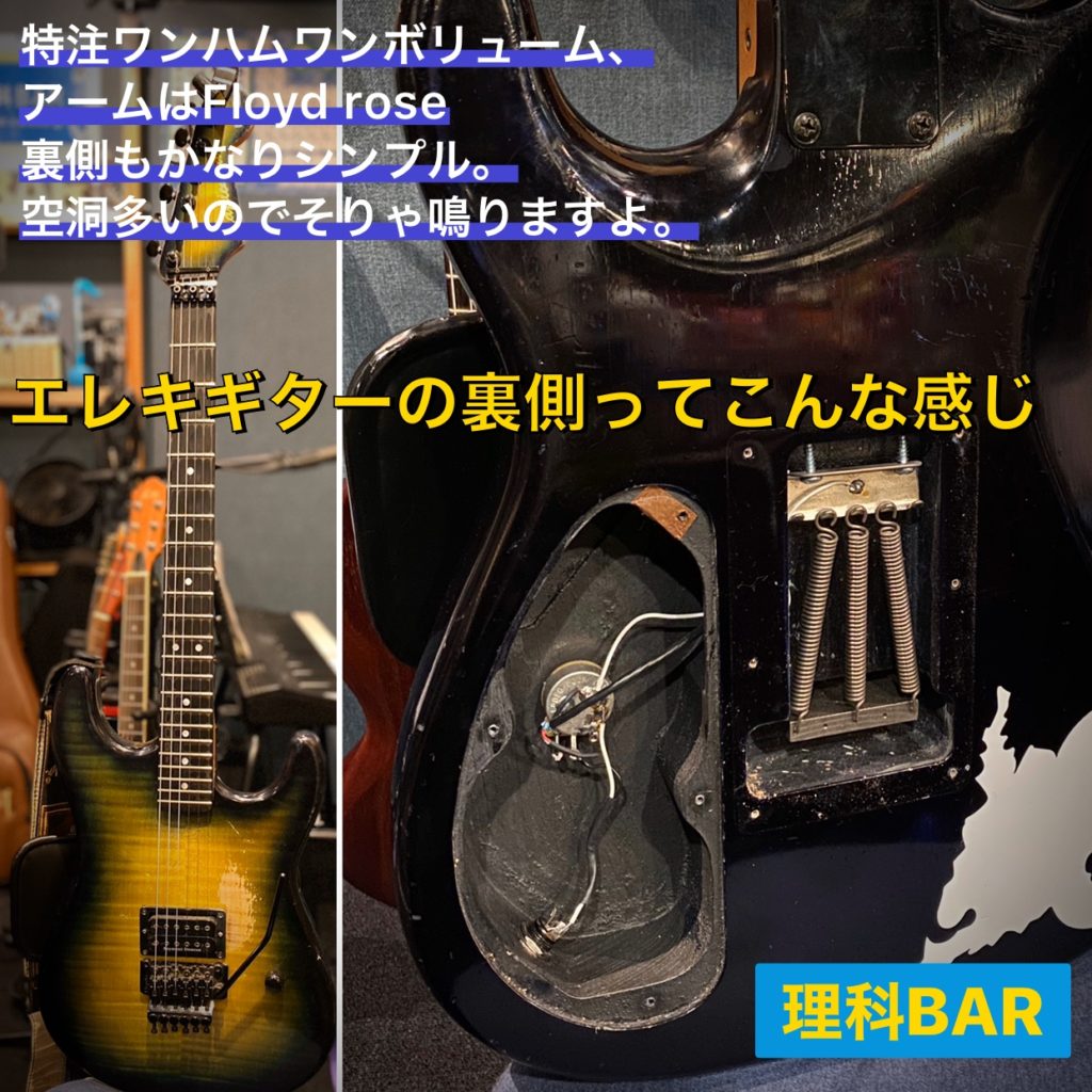 また、エレキギターはほとんどが弦で奏でた音を増幅する様な空洞が無いもしくは少ないです。そこで弦の音を拾って増幅させるマイクの役割に当たる器具が付いてます。左側の写真の穴の開いた棒が二つ並んでいる様なものが見えたらそれです。弦は鉄かニッケルで出来ています。中学の時にフレミングの法則を習いましたが、まさにあれがエレキギターの音を拾う原理なのです。ピックアップとは鉄の芯に銅線を巻いたコイルです。そのコイルに鉄の線を近づけたら離したりする事で電磁誘導が起きます。つまり銅線に電流が流れるのです。この電流をアンプまで伝えて増幅させるとエレキギターのあの音が出てくるという仕掛けなのです。