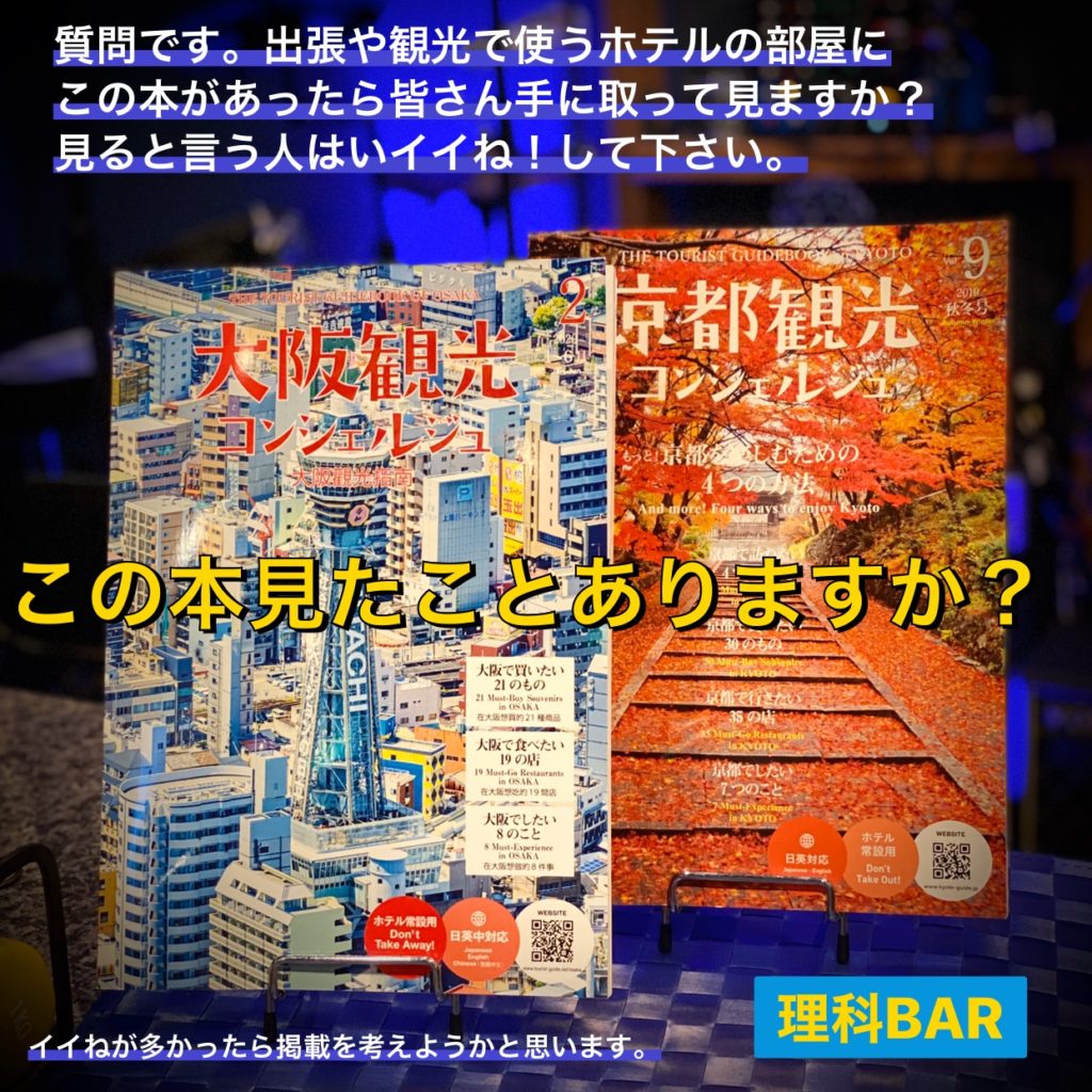 ホテルの部屋に置いてあるらしいこの本。果たしてこの本に掲載する事で集客アップが見込めるのでしょうか?正直現在有料広告媒体として自社ホームページ http://rikabar.com/ とこのサイトの二つ持ってます。他にもぐるなびサイトとエキテン口コミサイト、どこネットに掲載。無料なのはサントリーバーナビとGoogleマップ。SNSはインスタ、Facebook、タイムライン、Twitter、noteで毎日更新してます。あとはリロクラブにも載ってるはずです。おかげさまでここまで露出させてもらってますので、ご新規様のご来店もチラホラ頂いてます。これ以上媒体を増やすべきかどうか、悩んでいるのです。あとは費用対効果の問題にはなりますが。