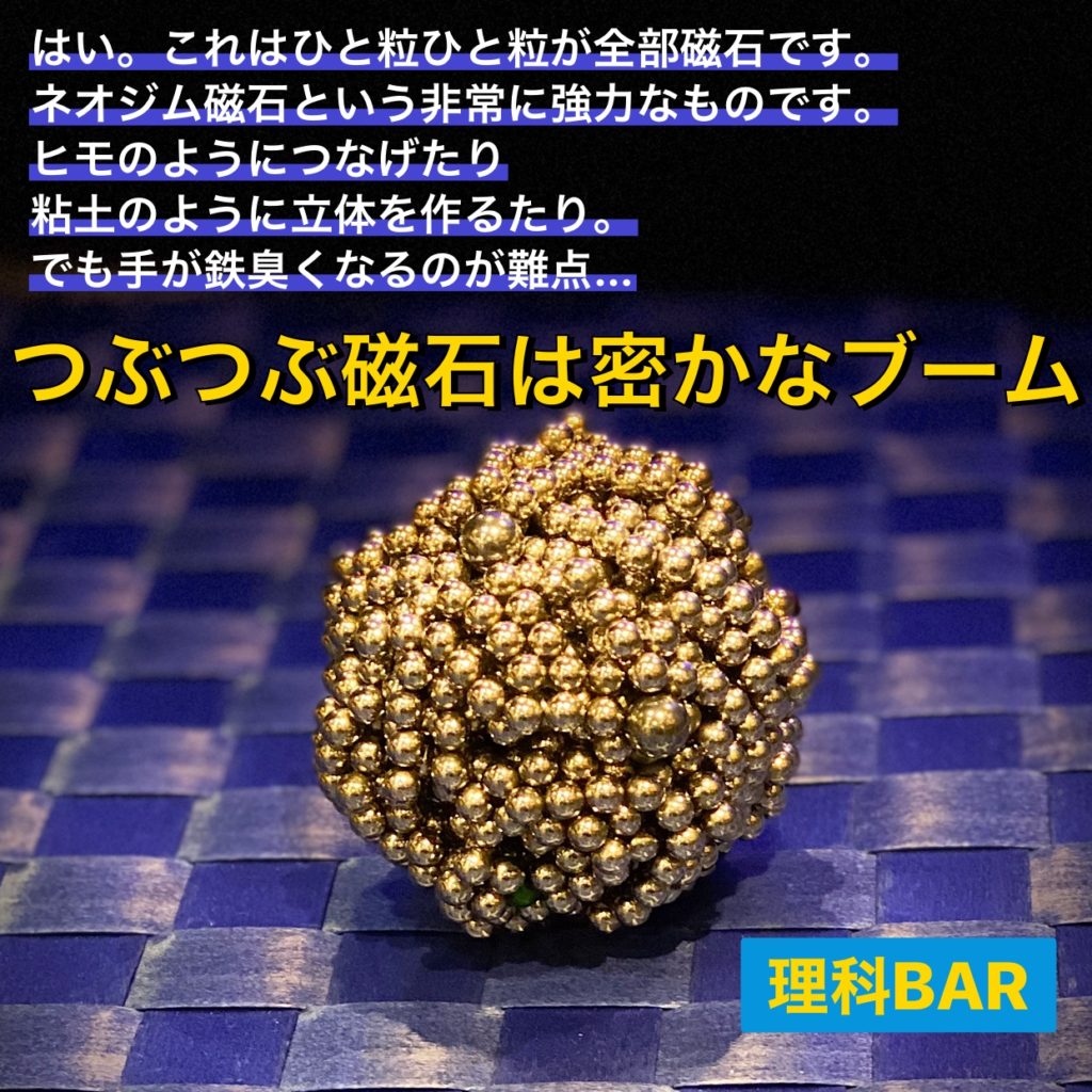 写真はつぶつぶ磁石です。ひとつひとつが全部強力なネオジム磁石です。直径5ミリの球体です。球体なので接触面積はほぼゼロに近く点でしかつながれないのですがそれでもくっつきます。これが面でくっつくと引き離すのが難儀です。子供では無理です。この球体をひとつずつつなげたらヒモのようにもなりますしまとめて粘土のように形を作る事も出来ます。ついいじってしますので理科BARでは大人気です。しかし手が鉄臭くなるのが難点で、必ずお絞りを追加してお渡ししてます。さてあなたはこれで何をつくりますか?