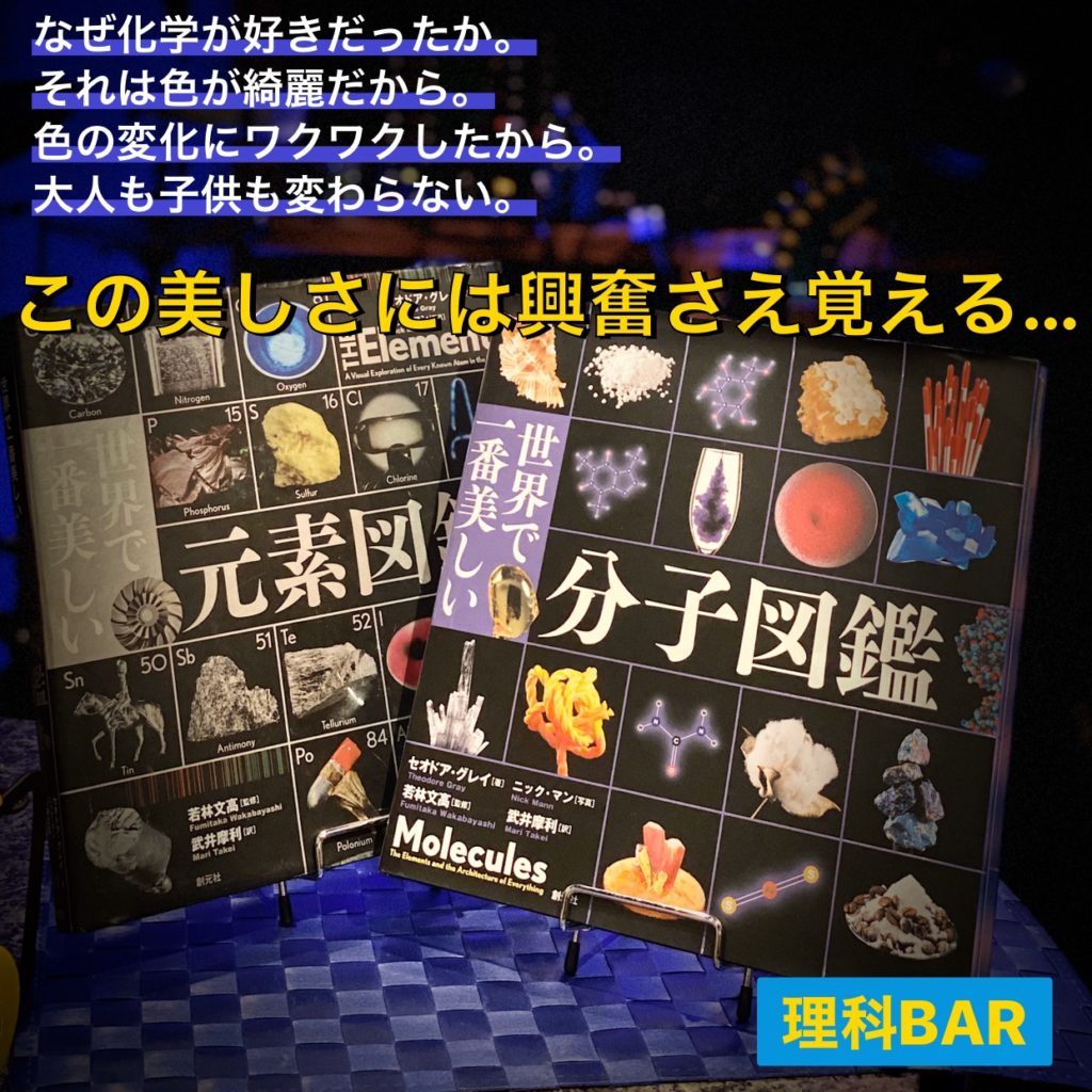 元素も分子もどちらも美しいです。どの物質がどうだかはどうでもいいのです。とにかく見て感動すれば、それだけで充分に脳は活性化します。あまり目にしないのも当然だと思います。普段の生活でミクロの世界に関わる事はありませんから。でも直接見えなくてもどこかでこういう世界が存在するのだと思うだけでも感動と興奮します。そんな世界の存在を知らせてくれるこの本に乾杯!
