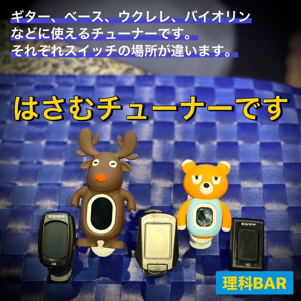 写真はクリップチューナーです。その昔はU字型の音叉を使ってチューニングしてましたが、最近はこれが手軽です。ギターのヘッドにはさんでスイッチ入れたらあとはギターの振動を感じてチューニング開始です。ただ、オクターブが違っても同じ音で認識してしまうので耳で聴きながら操作するのと併用をお勧めします。値段は500円くらいから2000円くらいまでです。使用されてる電池も同じなのでその辺は助かります。