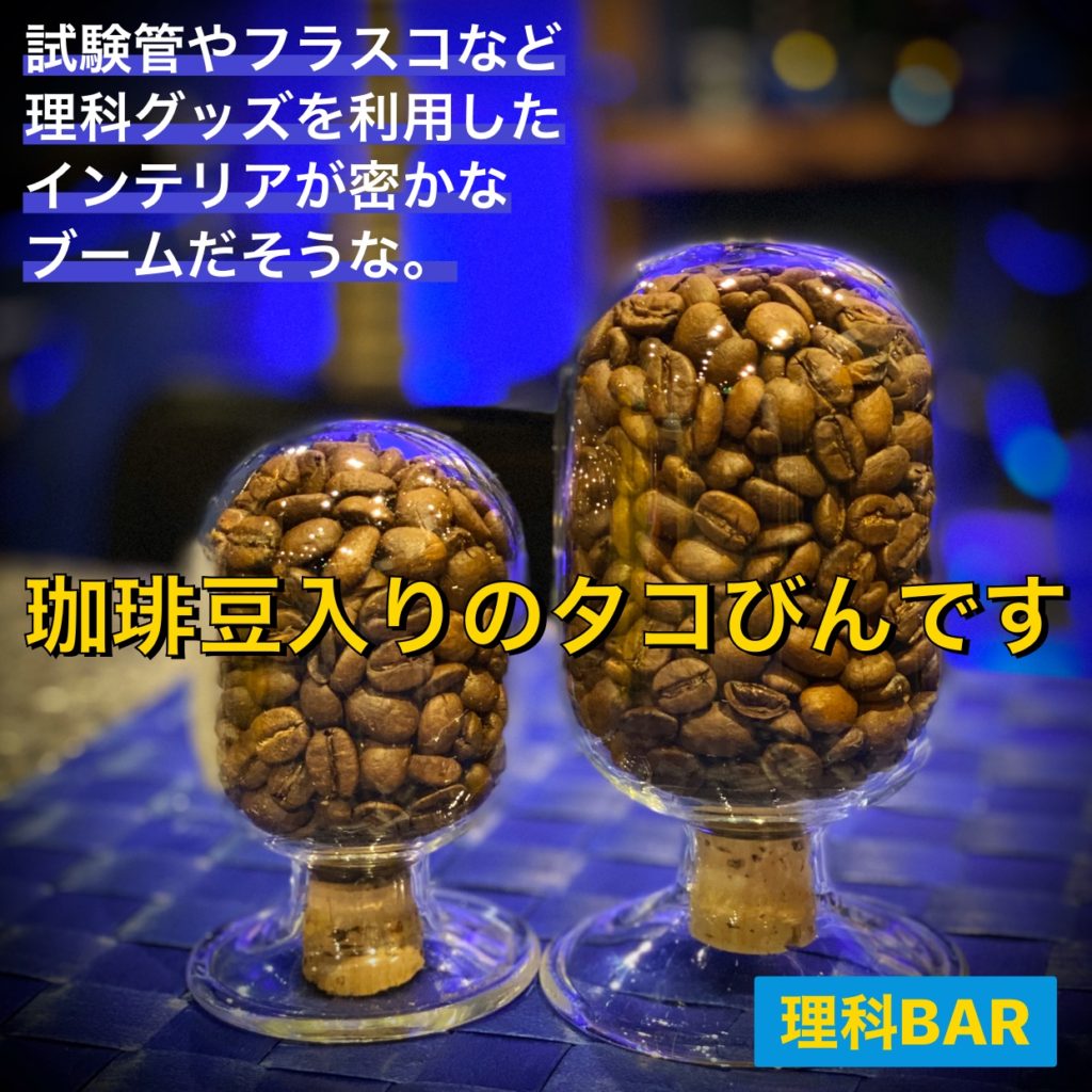 写真の珈琲豆入りのびんはタコびんと言います。底にビンの口があり、コルクで中身がこぼれないように栓がしてあります。理科BAR開店当初から備えてある理科グッズのうちのひとつです。よくよく考えると理科BARはほぼ8畳くらいのスペースですが、この中には100以上のアイテムがあるのです。楽器しかり理科グッズしかり色んなところに色んなモノが配置してありほぼすべてこだわりがあるものばかりです。なるべく減らそうとはしてるのですが、なかなか片付けられない性格なもので…。