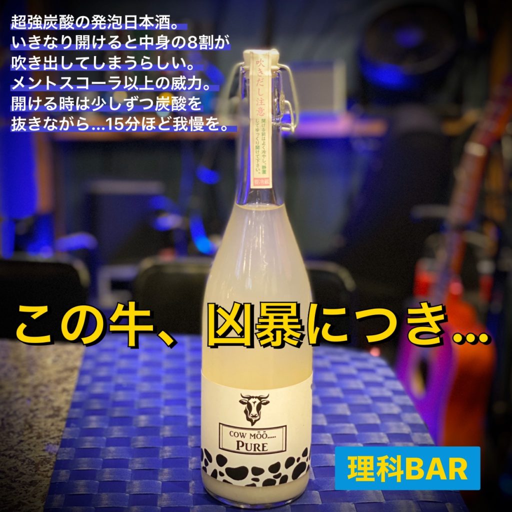 いつもお世話になっている梅本酒工房さんに行ったらこれを発見してしまいました。発泡日本酒です。しかもかなり強炭酸のようです。梅本さんにお話を伺うと、あまりにも炭酸が強いのでうかつに開けると中身の8割が飛び出してしまう、との事でした。栓を少しずつ開けて炭酸を少しずつ抜きながらちょっと炭酸が抜けたらまた栓を閉めてというのを繰り返すそうです。メントスコーラ以上の破壊力があるみたいなので、地味に地味に15分くらいかけながら開けるのです。もちろん苦労の甲斐あって無事開けたお酒は格別の味がするのだとか…。