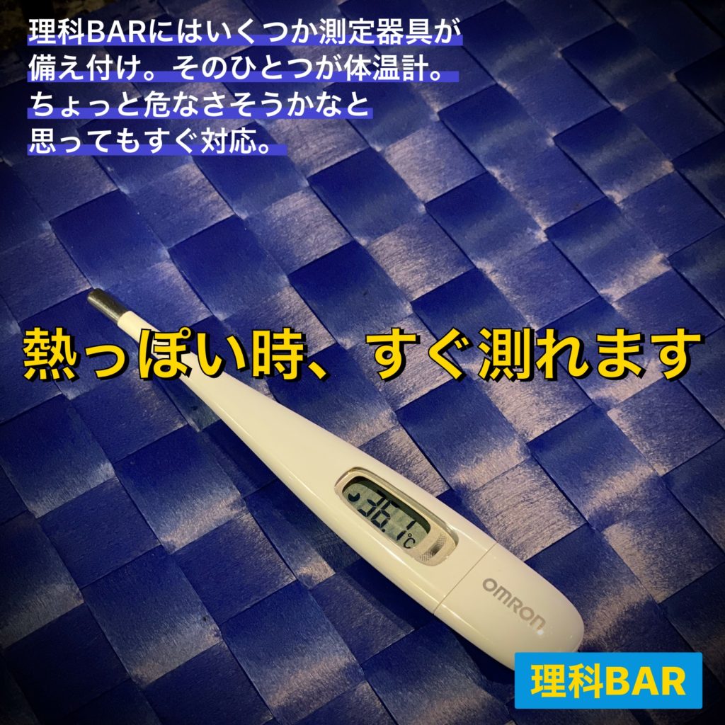 理科BARにはいくつか測定器具類を置いてます。やはり自分の何かに対して確認しておく事は1番興味のある事です。最近では体調の変化に対して感度が低かったなら命取りにもなりかねない状況もあり得るようです。本当は非接触の体温計を用意したいとも思ったのですが、現状ではこれです。30秒ほどお待ちください。また、ご使用の際は一度アルコールにて消毒してからお願いします。