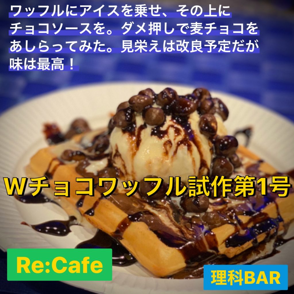 ワッフルはただ今改良試作中です。ホットケーキミックスに牛乳を加えたものをちょっとパリパリになるまで焼きます。しっとりのベルギーワッフルではなく、パリッとした食感のアメリカンワッフルです。実はあまり甘くありません。ですのでバニラアイスをトッピングします。これだけでは物足りない方もいらっしゃるので、これに甘味を追加します。ケーキシロップかハチミツ、そしてチョコソースを選べます。お酒が好きな方は抹茶リキュールもあります。でも、チョコ好きな方はさらに麦チョコをトッピングして軽やかな歯応えを追加していただきます。写真の試作品は綺麗とは言えない出来栄えですが、味は最高でした。糖質制限を忘れるくらいの美味しさは格別です。