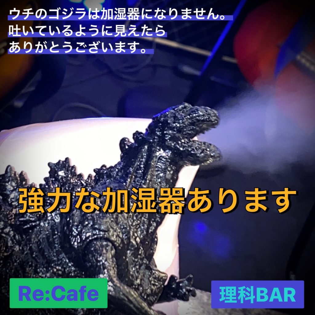 やはりコロナなどのウィルスは湿気に弱いので、湿度を充分に保っていこうと思います。そこで家にあった加湿器を店に持ち込みました。500mlの水が5時間くらいで無くなります。という事は店の空間の体積が約50㎥で、気温25度における飽和水蒸気量が23g/㎥なので湿度100%の場合での水蒸気量は店全体では1200gです。締め切っていた場合に湿度は計算上では40%くらい上昇するはずです。ただ、昼は扉を開けたままなので、そこまで上昇する事もないのですが、見た感じではかなり水分の放出に精を出してくれている加湿器です。
