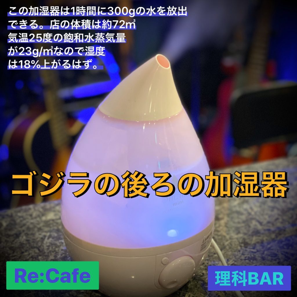 2020.05.04 ブログ 本物の加湿器はこちら 昨日改めて計算し直しました。天井までの高さ2メートルで計算してました。2.5メートルくらいは楽勝であるので店の容積は70㎥ということで訂正です。店の中の湿度はいつも30%前後の時が多いので、かなり助かります。 ブログ一覧