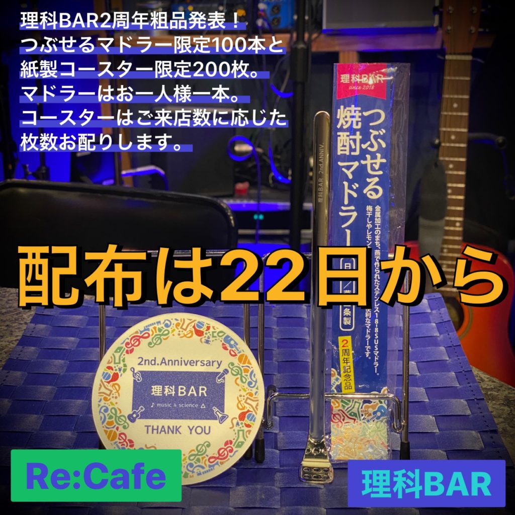 5月22日から2周年粗品の配布を行います。ご来店毎に1枚ずつもらえるのは紙製2周年コースターです。これは200枚限定です。もし枚数が無くなる前に10回ご来店されたら10枚もらえます。また、お一人様一本限りなのはステンレス製つぶせるマドラーです。こちらは100本限りです。例えば梅干しを焼酎に入れた時にこのマドラーなら簡単につぶすことが出来ます。洋食器の生産で有名な新潟県燕市製です。こんな時期ですのでコッソリとご来店下さい。