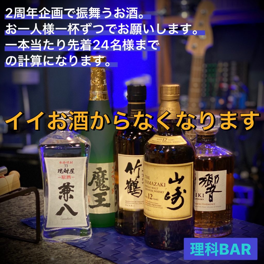 ・山崎12年などのイイお酒を提供します。原則どれかを一杯のみで。