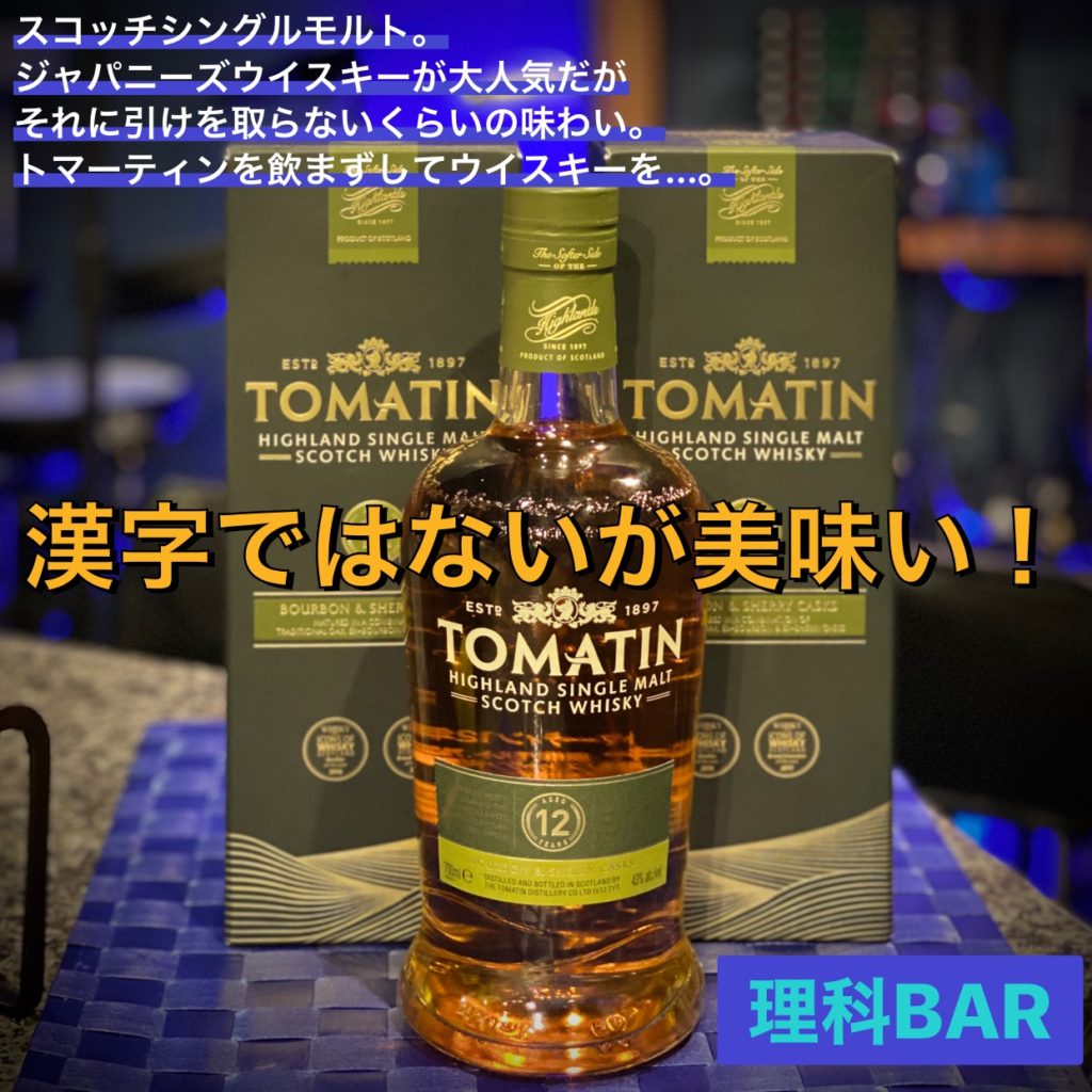 スコッチシングルモルトです。しかも12年ものです。甘くまろやかな香りと口当たりは絶品といえます。お酒はどうしても知ってるとか聞き慣れてる銘柄に行きがちですが、このウイスキーは外れません。食と情報は密接な関係であり、トマーティンより知多とか白州をありがたがる人が多いのも事実です。しかしこのトマーティンはお値段は知多や白州と同レベルながら味わいは響に近いレベルです。1度ブラインドテイスティングをしてもらいたいと思うくらいです。多分勝てるはずだと思うのです。