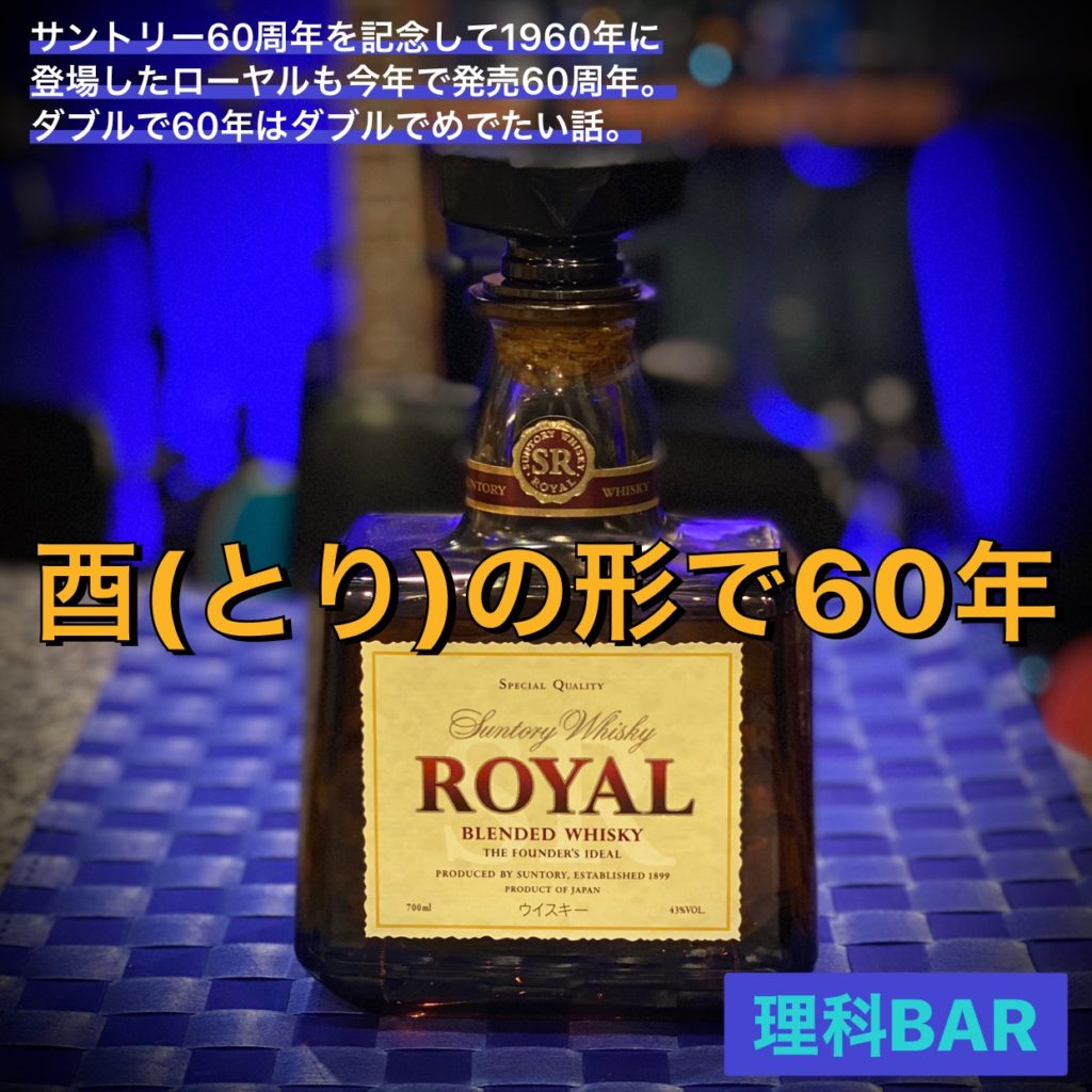 自分が大学生だったのは今から約35年前です。その頃は高級ウイスキーとして君臨していたのがこのローヤルでした。改めて調べてみますと、様々に工夫がなされていたスペシャルなウイスキーだったのですね。発売は1960年で、その年はサントリー創業60周年にあたる年だそうです。ボトルの形は酒の文字の右側の酉を模したものです。さらにボトルの栓も鳥居の形になっているのです。ダブルでトリが隠されていたのは新しい発見でした。さらにローヤル発売の1960年から数えますと2020年の今年は丁度60年目に当たります。元号も明治から創業して大正、昭和を経て60周年を迎え、さらに平成から令和へ合わせて5つもの時代を生き抜いた事には敬意を表するものであります。自分より5歳ほど歳上のこのウイスキーが少し好きになりました。