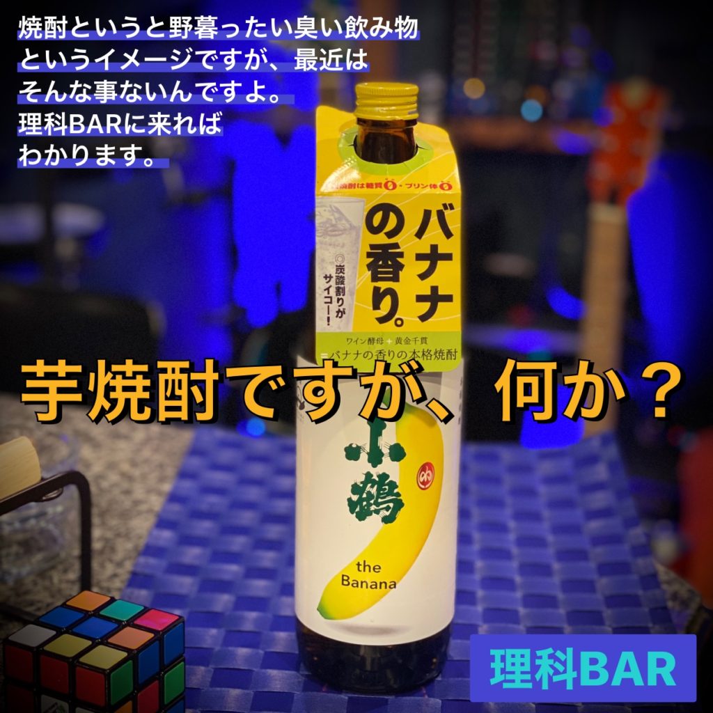 黄金千貫にワイン酵母を使って発酵させるとバナナの香りになるようです。その他ライチの香りとかバニラの香りの焼酎も作られています。もともと焼酎は安く手軽に呑めるお酒で翌日に残りづらいという特性もあります。なのに野暮ったい臭い飲み物のイメージはかわいそう過ぎます。理科BARではそんな焼酎の間違った固定観念を崩したいと思い香り焼酎をラインナップに加えています。どうぞ体験して下さい。目から鱗が落ちるとはこの事です。