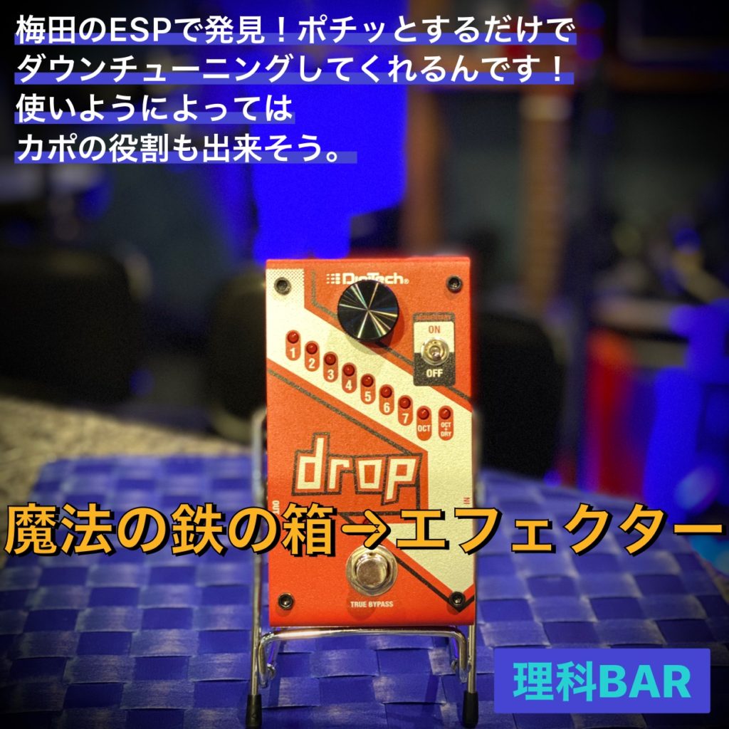 エレキギターで言えば、弾いた音を電気信号に変えてアンプに入る前にエフェクターという箱に一旦入れます。ここで電気信号を大きくしたり複製したり波形を変えたりします。今回のこの箱はエフェクターという箱です。ギターの音程を切り替えてくれるものです。目盛りの数だけ半音ずつ下げてくれます。ギターにはどうしても下の音には限界があるのですが、これなら7半音、いわゆる半オクターブまで下げてくれるのです。なかなか手に入らないでモヤモヤしていたのですが、この度梅田のESPで発見しました。レギュラーチューニングで弾きながらダウンチューニングの音を出せるので、KISSとかヴァン・ヘイレンなどのダウンチューニングをしている人達の音をたやすく再現出来るようになりました。全く有り難い話です。