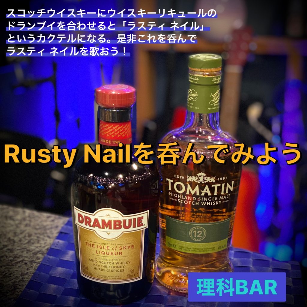 歌の題名とカクテルの名前がたまたま一緒なだけです。ラスティネイルとは「錆びた釘」という意味です。スコッチウイスキーを40mlにウイスキーリキュールのドランブイ20mlを合わせるだけのカクテルです。