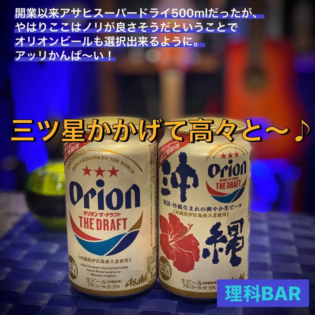 理科BARはミュージックBARです。ですから、お酒も音楽にちなんだものを増やしていきたいと考えてます。この前のラスティネイルというカクテルもそのひとつですが、今回は「オジー自慢のオリオンビール」をそろえてみました。最近では沖縄ビールも身近になり、コンビニでも手に入ります。でも普段飲むビールになっている人は少ないのかも知れません。たまに出かけて呑むならばいつもより特別感を求める人が多いように思えます。特にウチのような店はその傾向が強いです。ここらで一発騒いでみましょうか。三ツ星かかげて高々と。