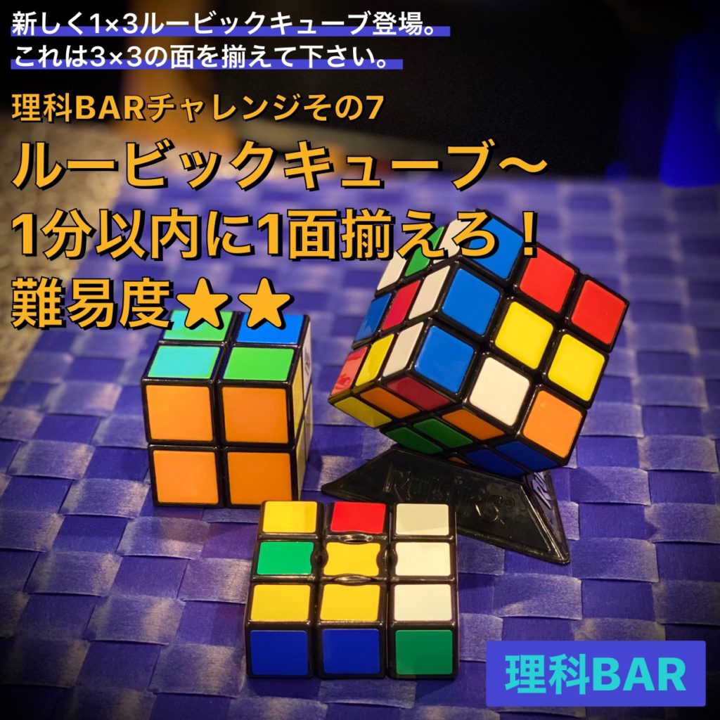 2020.07.15 ブログ 理科BARチャレンジその7〜ルービックキューブを1分以内に一面をそろえる!難易度★★ 今回新しく1×3を投入しました。これは3×3の面を揃えて下さい。チャレンジ回数は1度きり。練習は何回してもいいですよ。 ブログ一覧