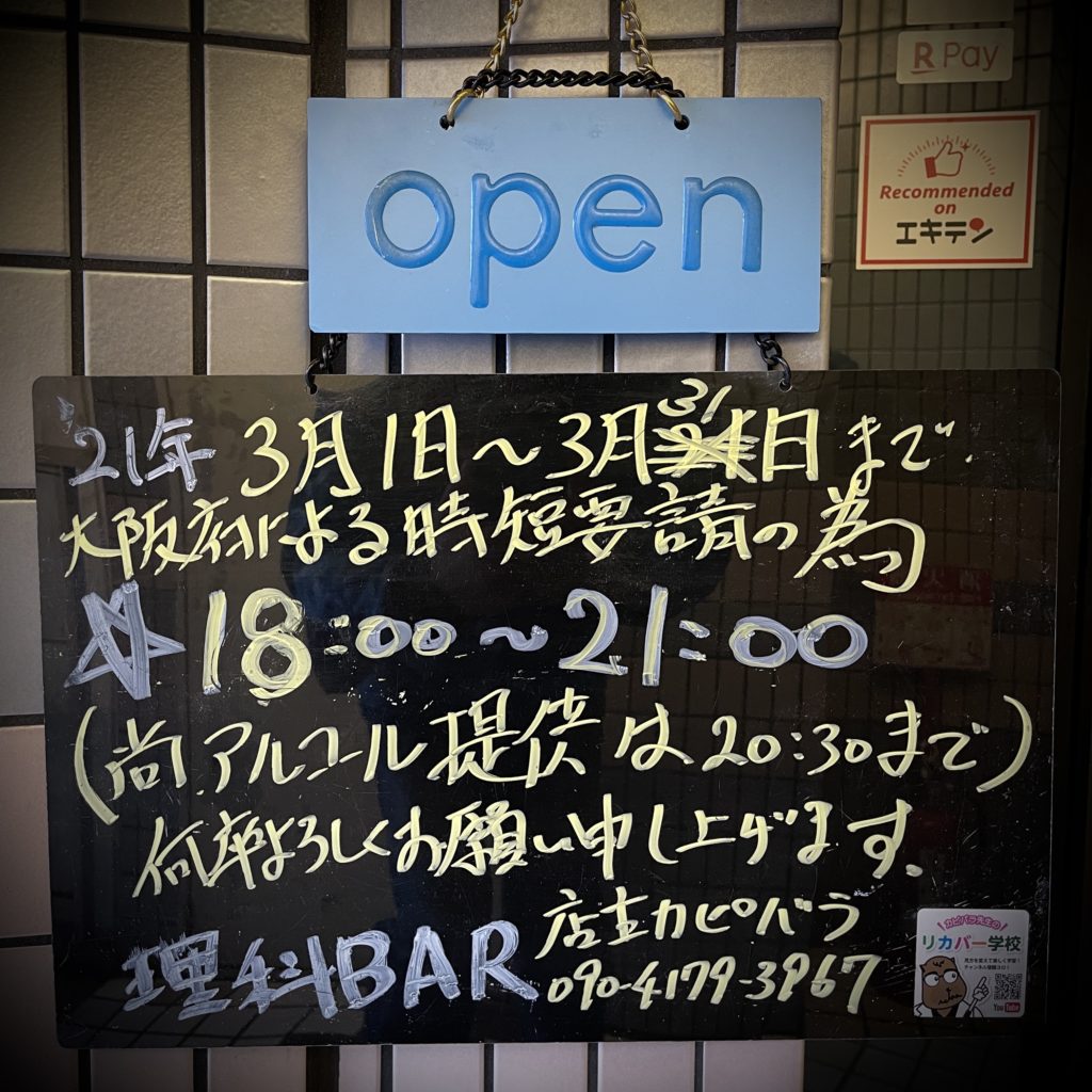 2021.03.22 ブログ 3月31日まで時短営業となります。 大阪府の時短要請延長を受け、3月31日まで営業時間を18時から21時、アルコール提供は20時30分までとさせて頂きます。今後も新型コロナ感染症拡大防止策として検温と消毒の徹底を行ってまいります。何卒よろしくお願いします。 ブログ一覧