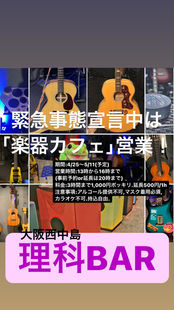 <楽器カフェ営業>緊急事態宣言発出により4/25〜5/11(予定)は「楽器カフェ」として13時から16時まで店を開けます.事前予約or延長は20時まで.最高3時間1,000円ポッキリ(延長500円/1時間).アルコール提供不可,マスク着用必須,カラオケ不可.持込自由.